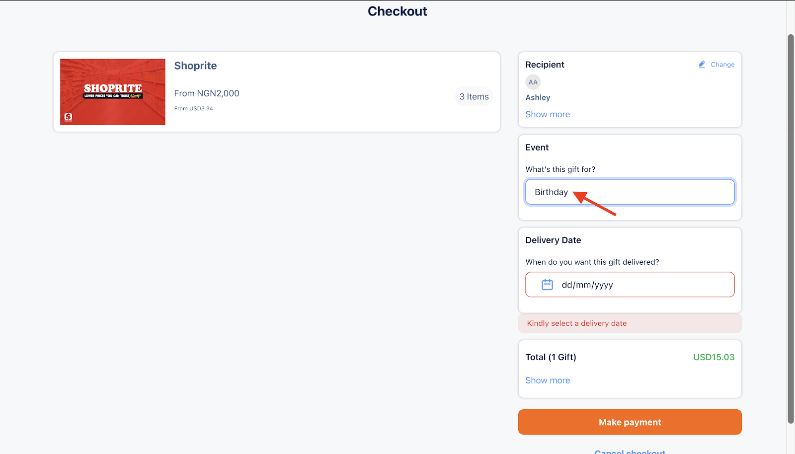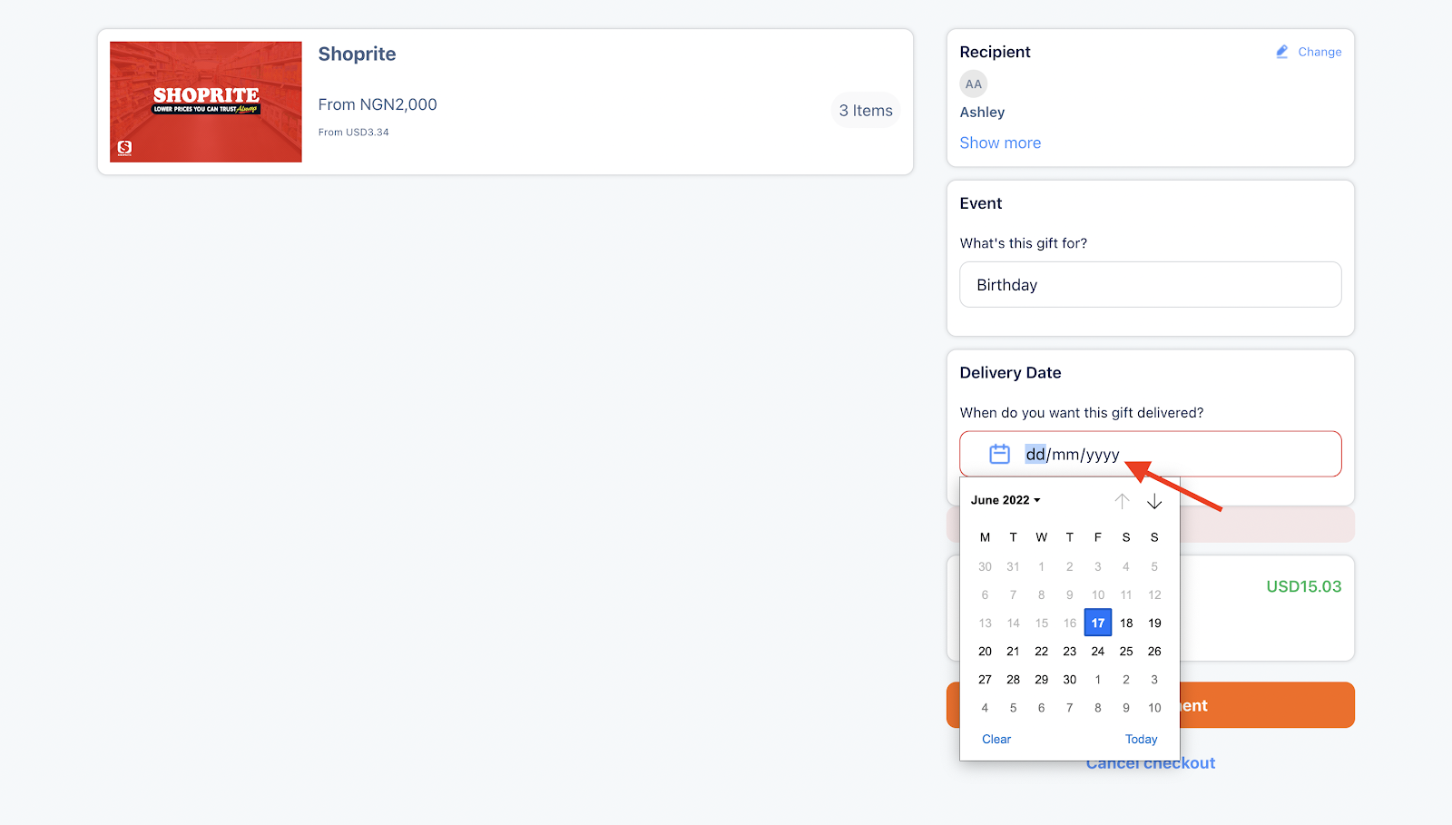 Step 11: Select the delivery date and input the delivery date of the gift card (s).