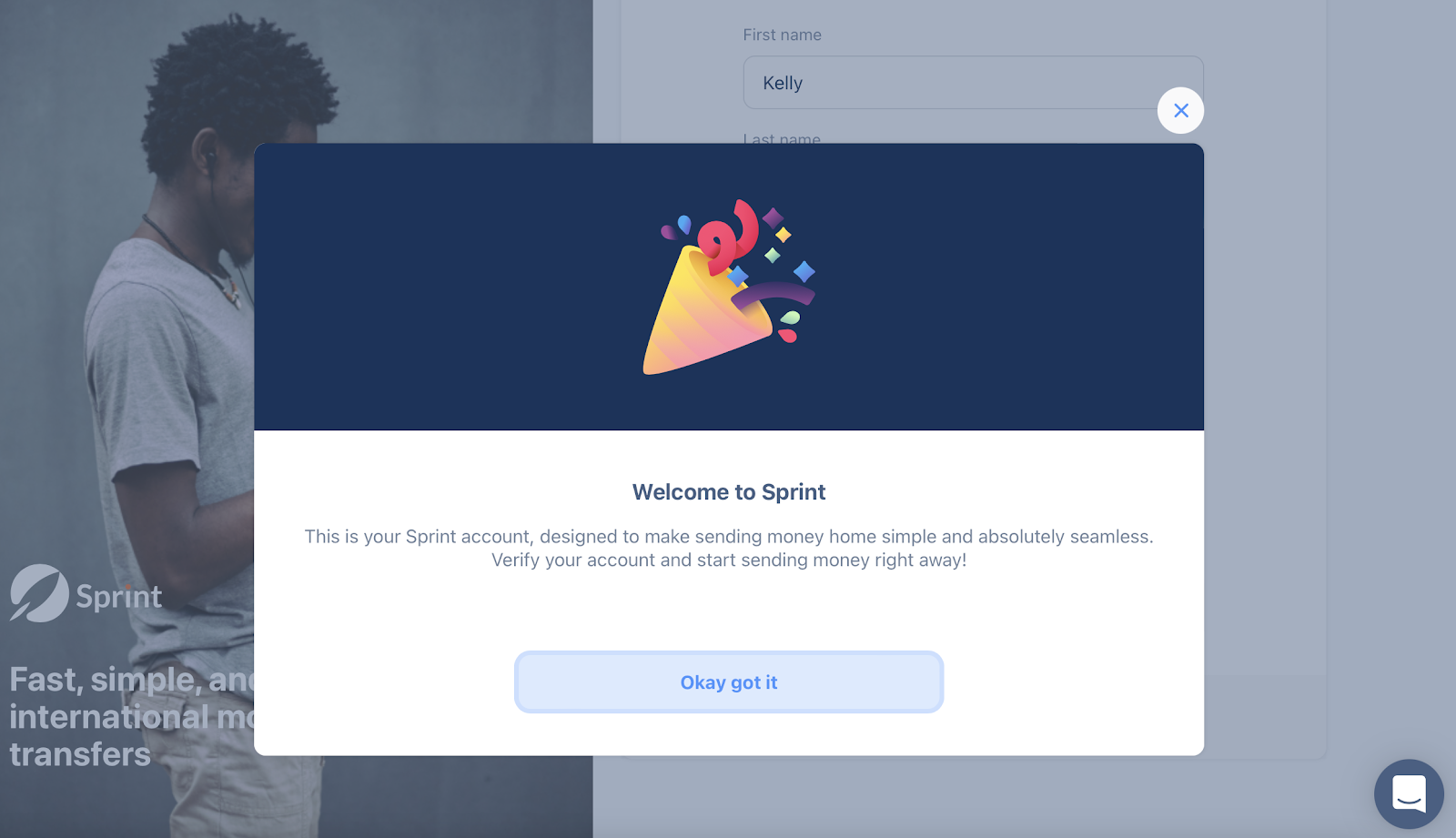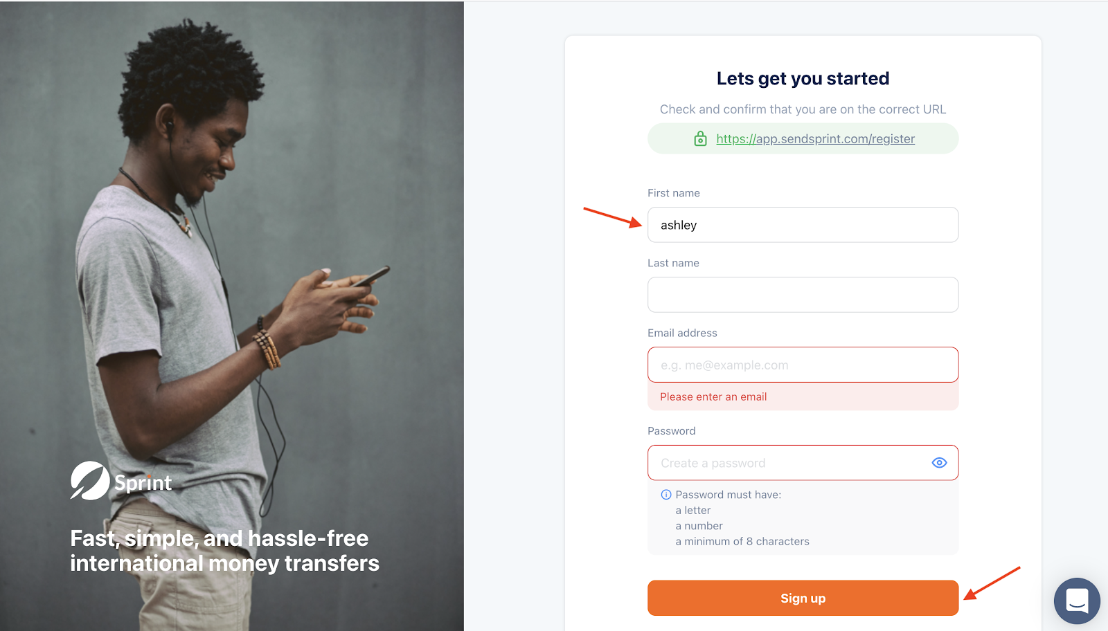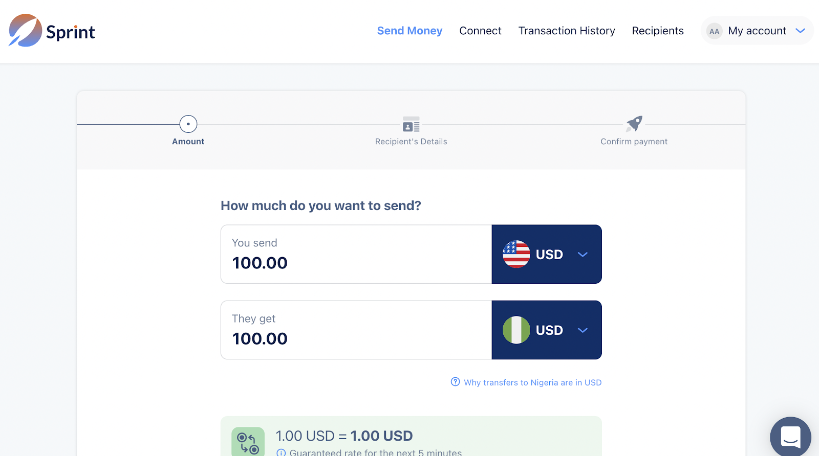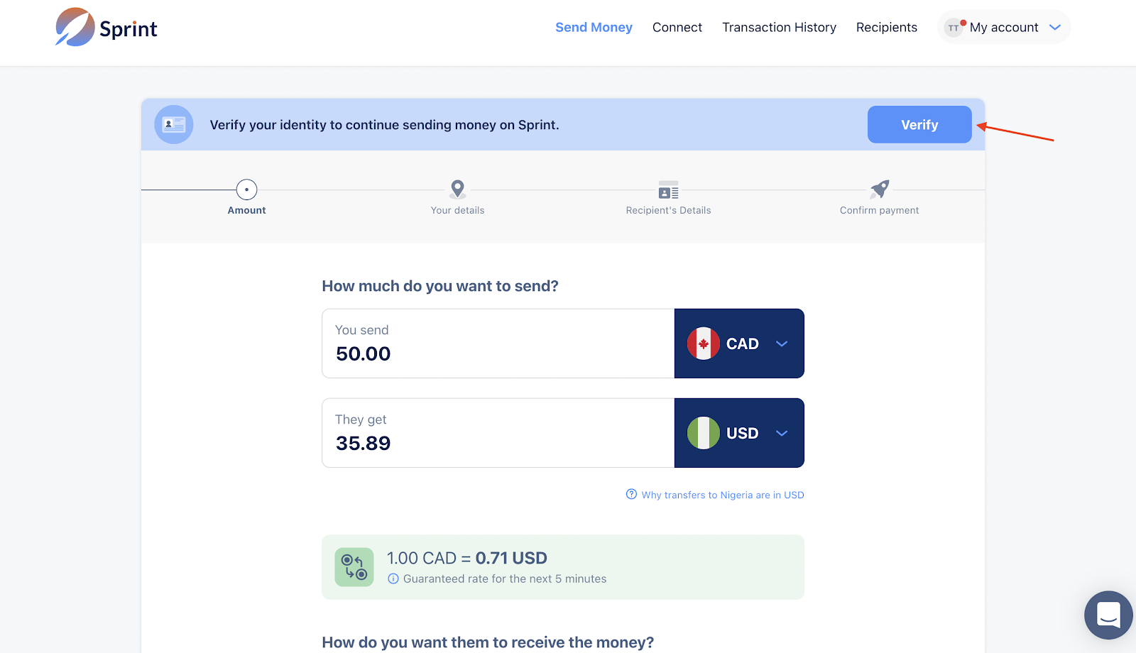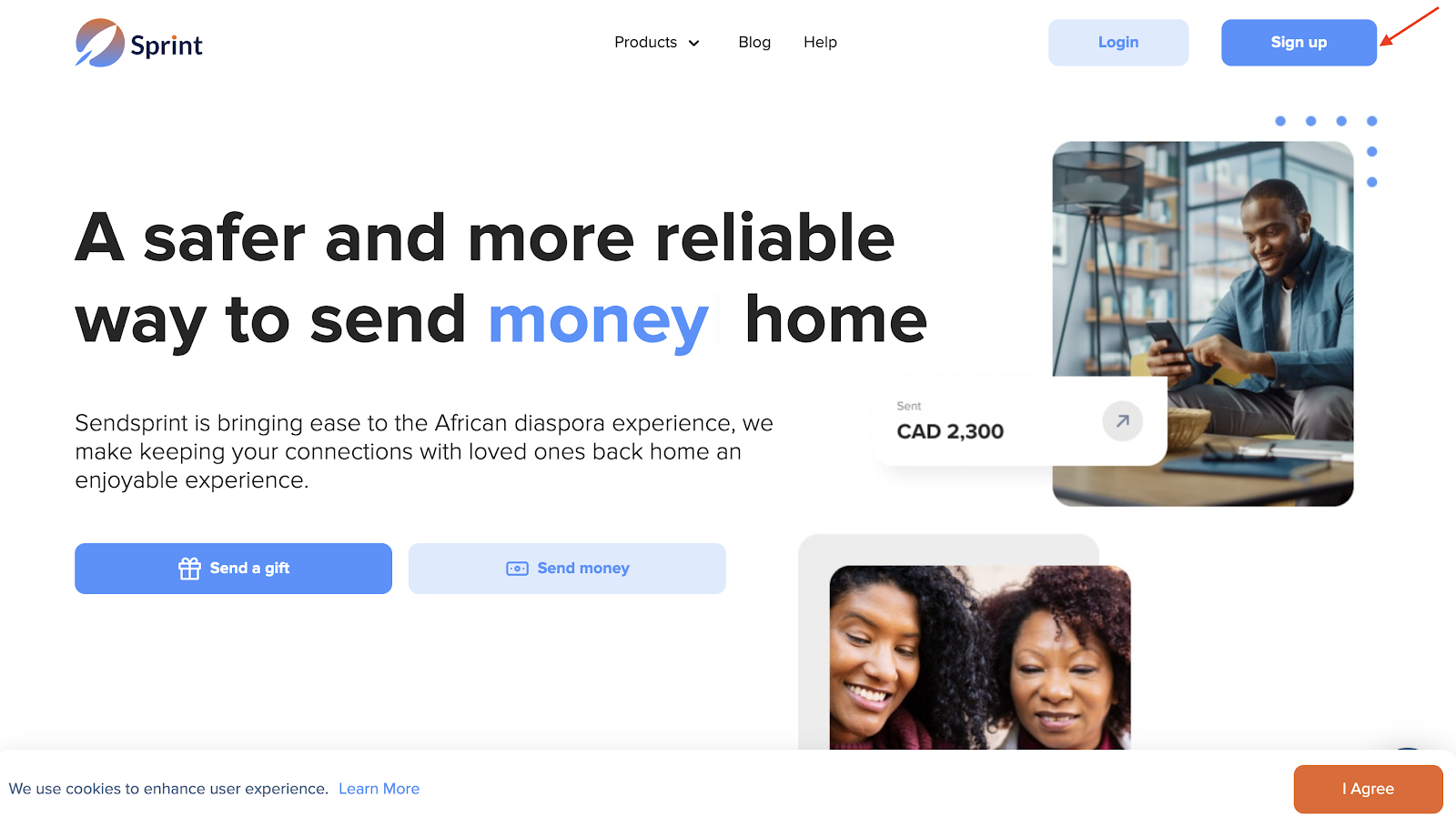 Step 7: When you're successfully logged in, you will arrive on the SendSprint Dashboard to access Send Money (for money transfers) and Connect (for gift card shopping).
